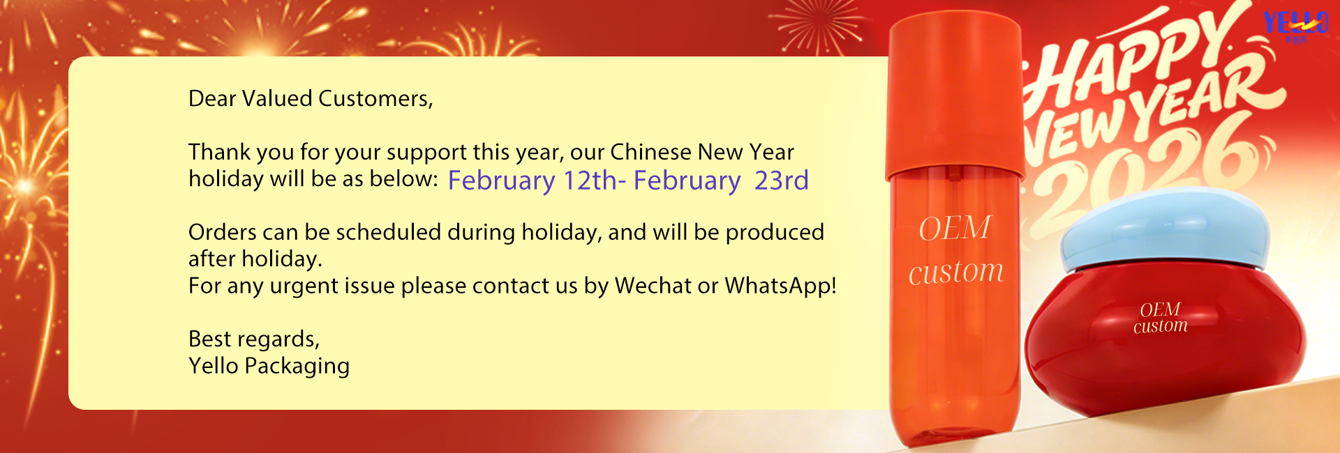 Thank you for your support this year. Our Chinese New Year holiday will be as follows: February 12th – February 23rd.